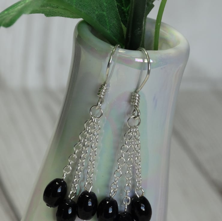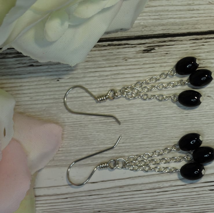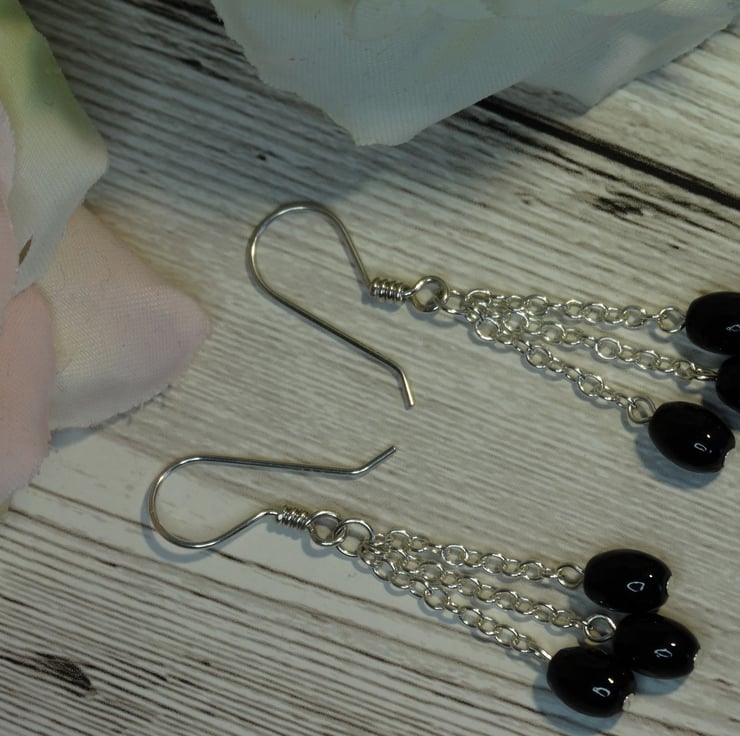 There are 3 lengths of chain on each earring, the central one being approximately 2 mm longer than the outer two. A small black rice bead hangs from the end of each chain.