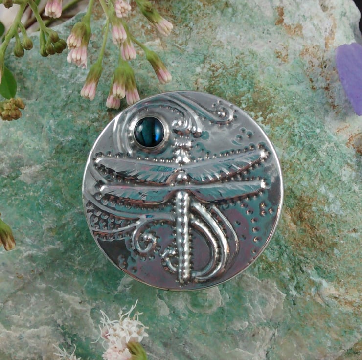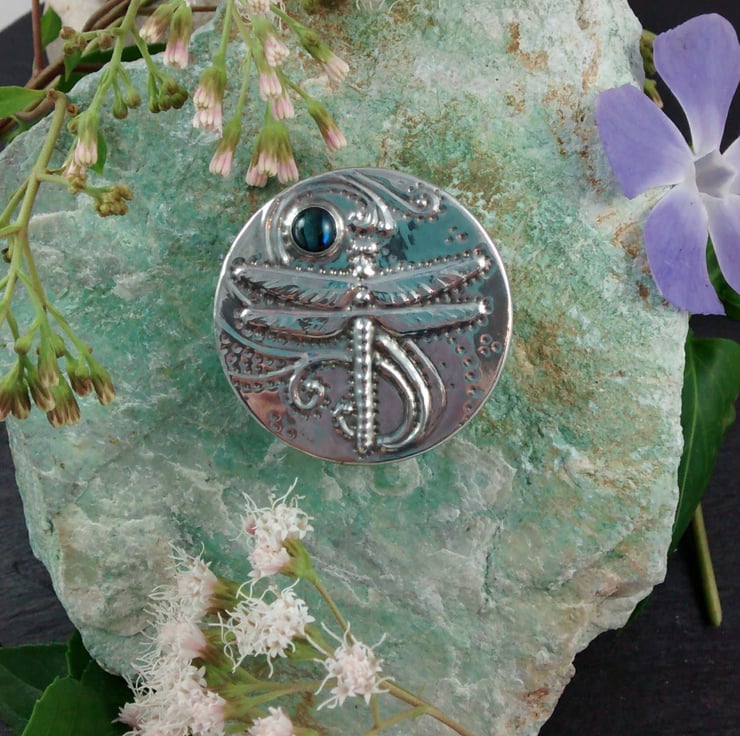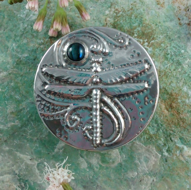 Shiny silver pewter dragonfly brooch, handmade with blue-green paua shell cabochon.