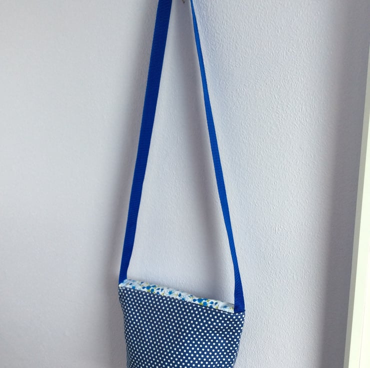 A cotton reversible bag which has a long strap for wearing over your shoulder or a cross body bag