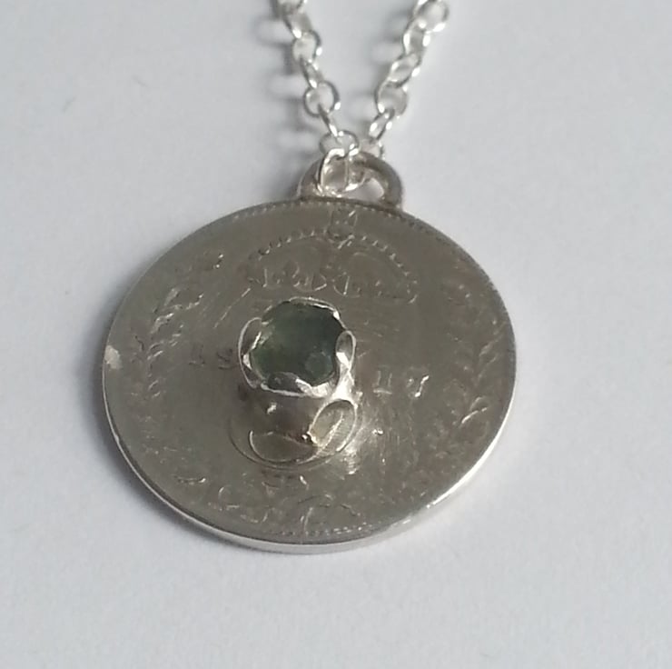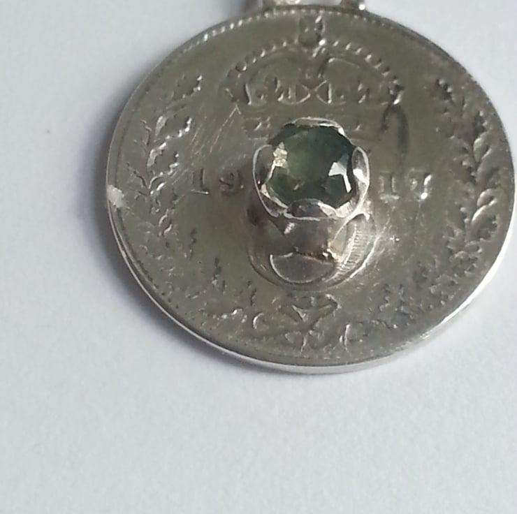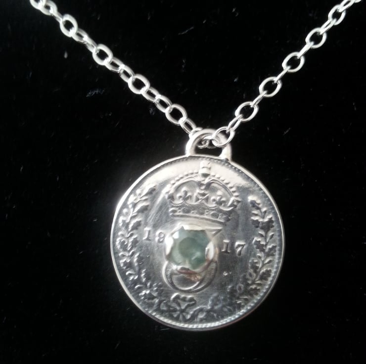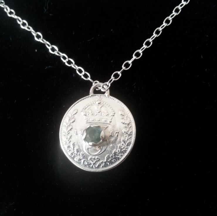 This 1917 Threepence has been set with a beautifu 4mm aqua coloured sapphire in a handmade coronet setting.