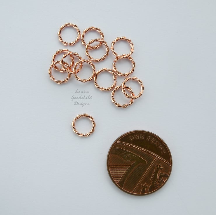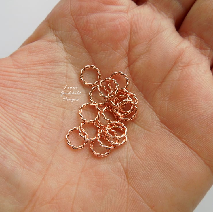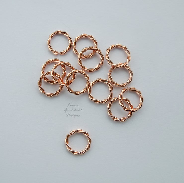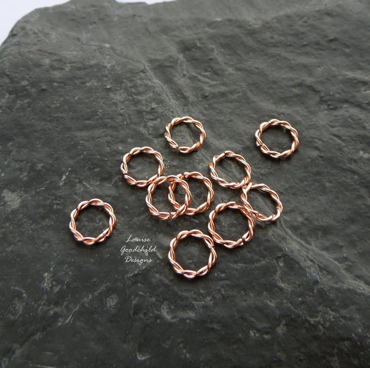 Made from two lengths of 0.6mm solid copper wire, which I twist together, shape, cut, file, hammer and tumble. I then polish them with Renaissance wax - however, as they are bare copper, they may still be subject to tarnishing - please treat them as you would other solid copper components. Please note, these are open jump rings (not soldered).