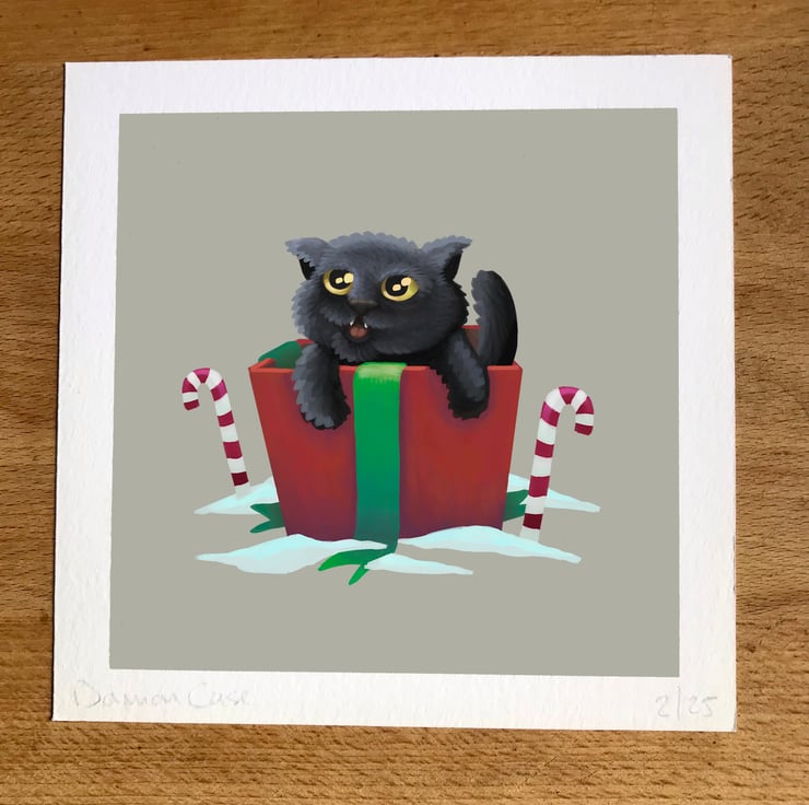 Be one of a select few to own one of these festive 'Christmas Cat in a Box' limited edition art prints. Printed on 6" by 6" German etching paper with a 1” white border. Printed to order so can take up to 14 days to arrive. Print is numbered and signed by DuffleCat Prints artist Damian Case. Print is unframed.