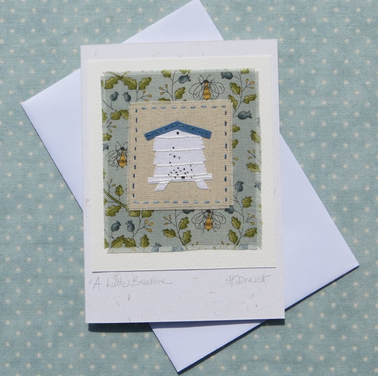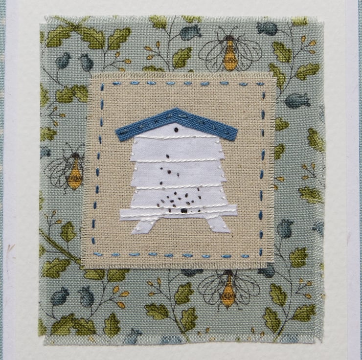 A unique hand-stitched miniature applique with embroidered details worked on a beautiful background fabric of foliage and bees! Bees are a welcome sign of Spring so this card is perfect for a Summer birthday or other occasion. The card would make a lovely gift framed too!