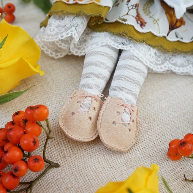 I have dressed her in a lilac cotton fabric by Liberty, it is a tana lawn called Floral Eve, a lovely late summer print. The dress is covered in an organic pattern of pressed summer flowers in a soft colourway. She has matching bloomers and underskirts in coordinating cottons and lace.