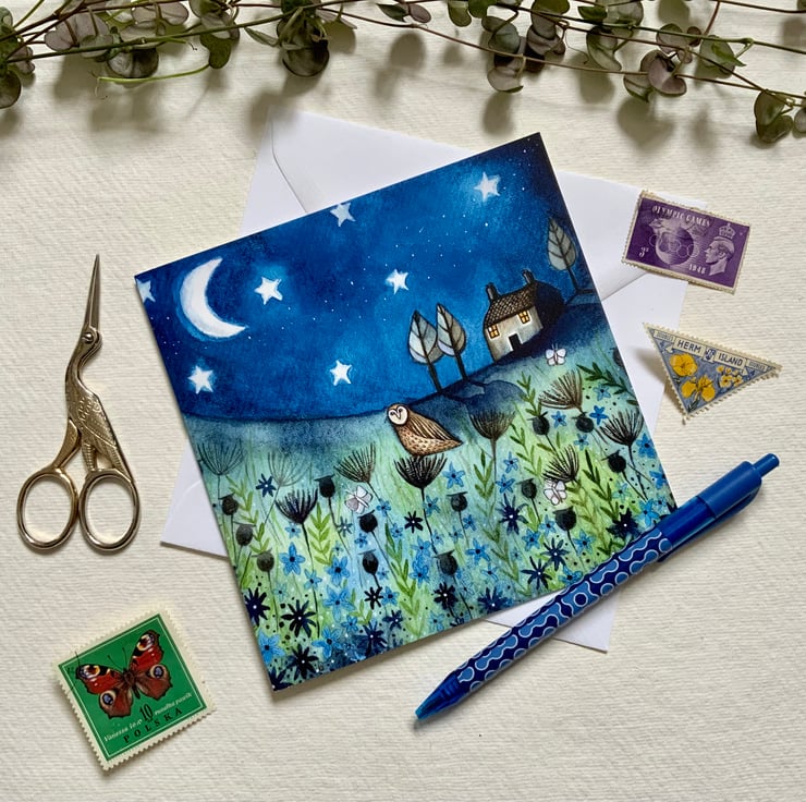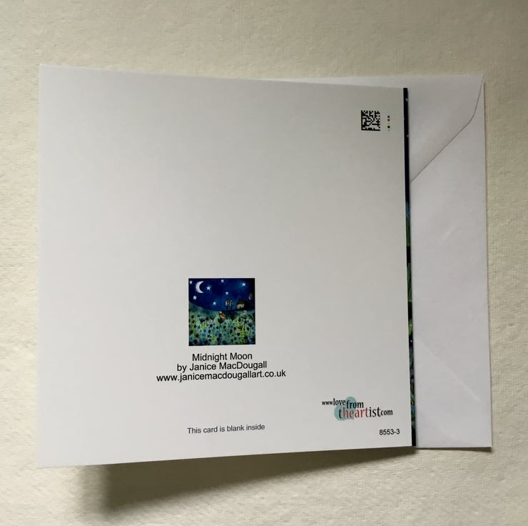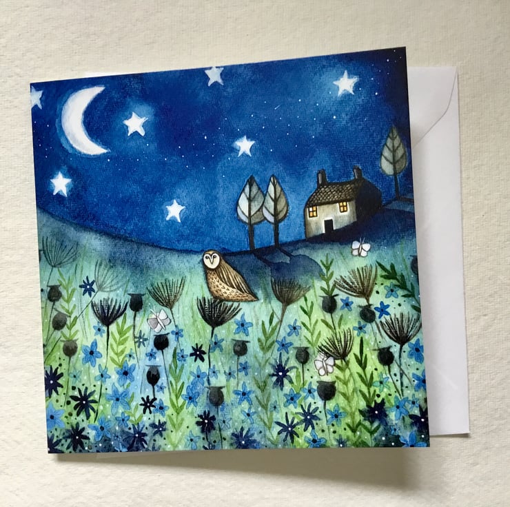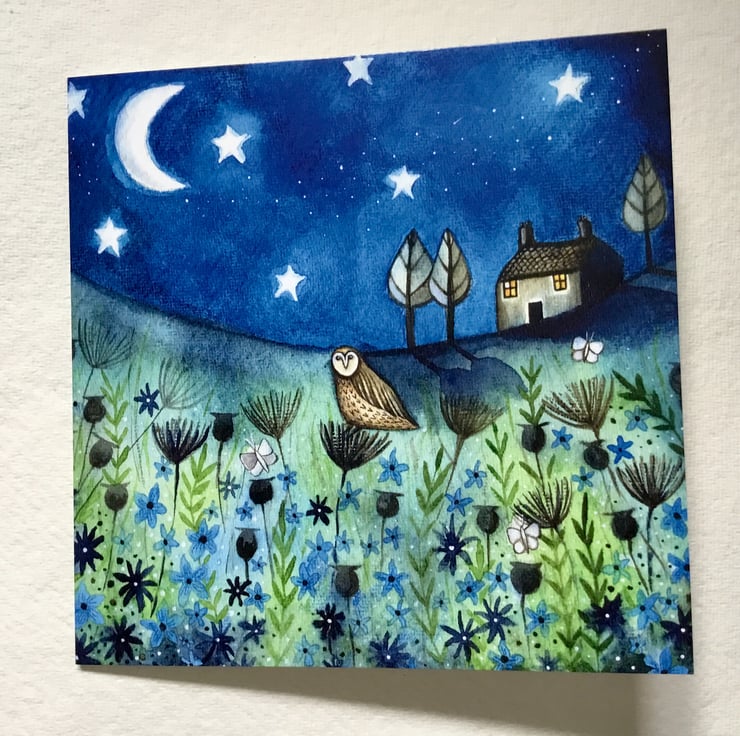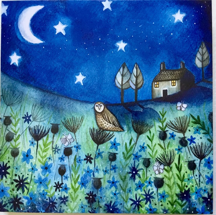 This card has been printed from an original painting that I did, featuring a barn owl under a crescent moon and starry sky. It is a blank greetings card making it suitable for a variety of occasions. It measures 14.5x14.5 cm and comes with an envelope