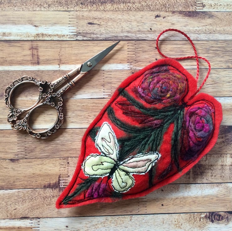 This padded handmade original decoration is of a free motion embroidered butterfly on a felt backed patterned leaf, which I have enhanced with felting wool. It measures 15cm x 9cm approx. With the ribbon the length is 22.5cm.