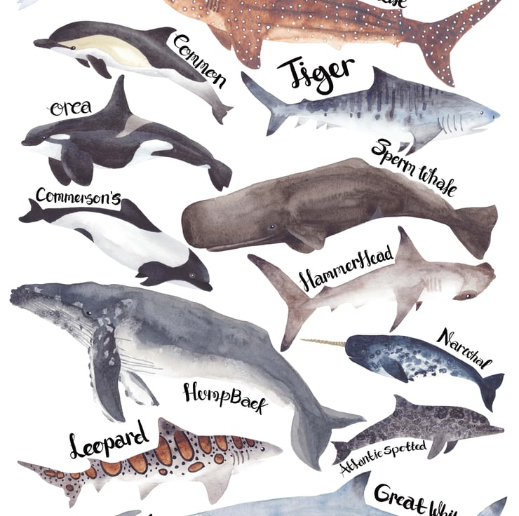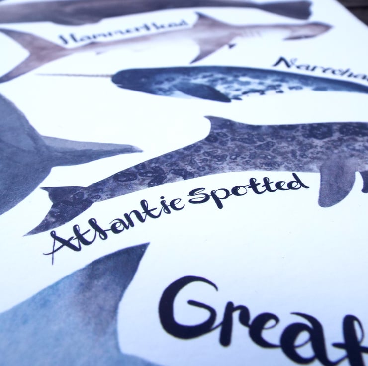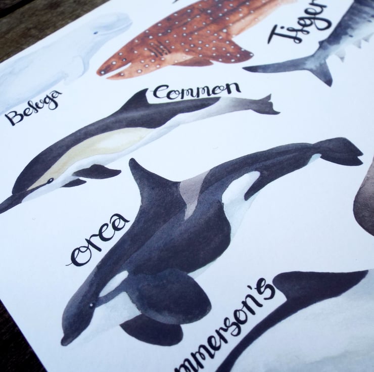This under the sea watercolour prints of whales, Sharks and dolphins as been printed on to A4 Tintoretto Gesso 300gsm paper and has been placed into a cellophane bag to protect it. These Whales, Sharks and dolphins all have the names of their species close to them with hand drawn ink lettering, the creatures themselves have all been hand drawn and hand painted using Winsor and Newton Cotman Watercolours and have been created into a print for you to enjoy. (frame and clips not included)