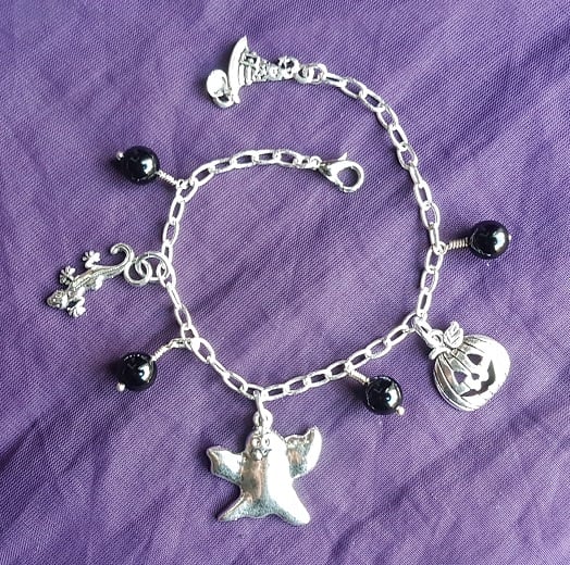 Gorgeous black onyx bead halloween charm bracelet. Creepy-cute and great as an everyday piece or as part of your Halloween costume. Freaky-Fabulous with a ghost, pumpkin and lizard charm.The chain is silver tone and fastens with a trigger clasp.