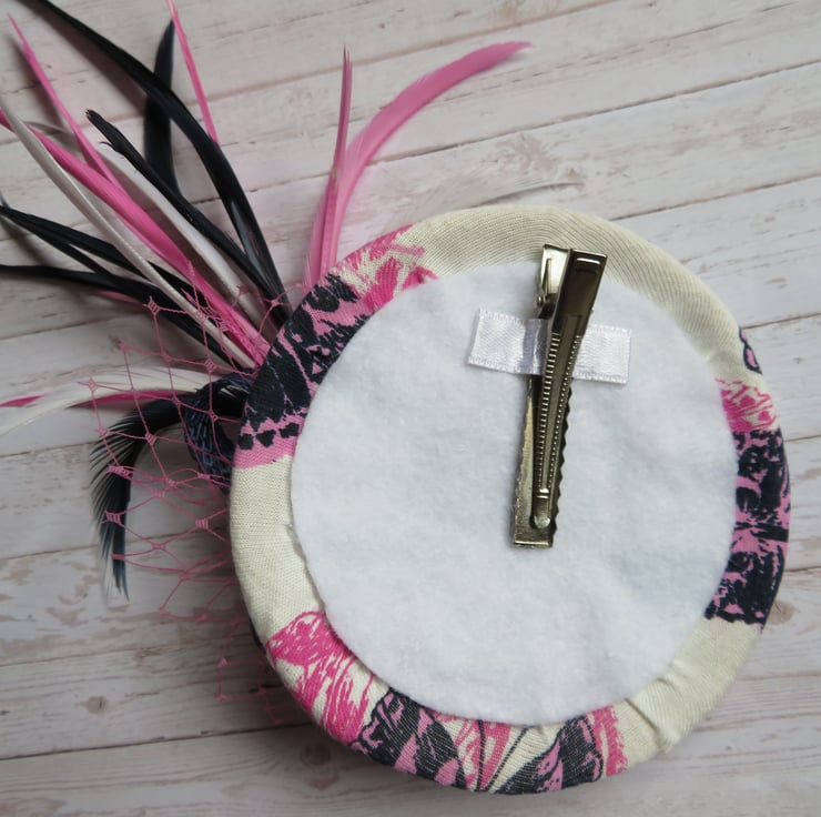 Complemented with a plume of white, navy & pale fuchsia biot feathers, fuchsia pink veiling detail, navy sinamay mini bow and a navy sinamay ruffle with a pearl and bugle bead detail.