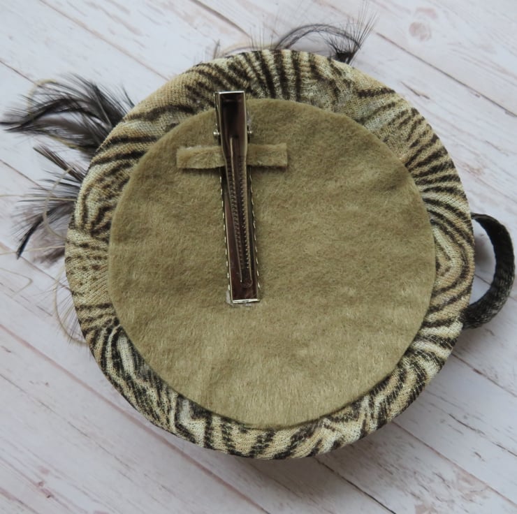 Covered with an animal stretchy fabric with a beige circle of felt underneath with a large single metal croc clip for fixing.