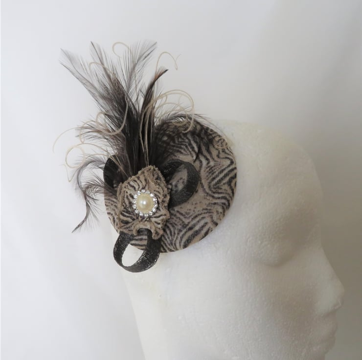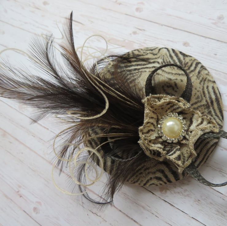 This 'Animal Print Emma' fascinator mini hat is ready made and can be shipped straight away.