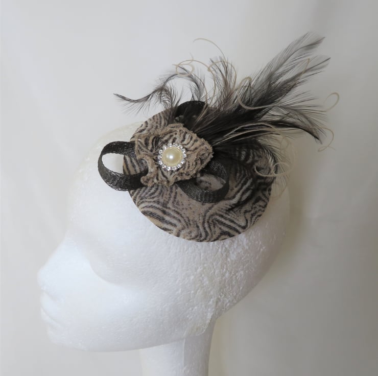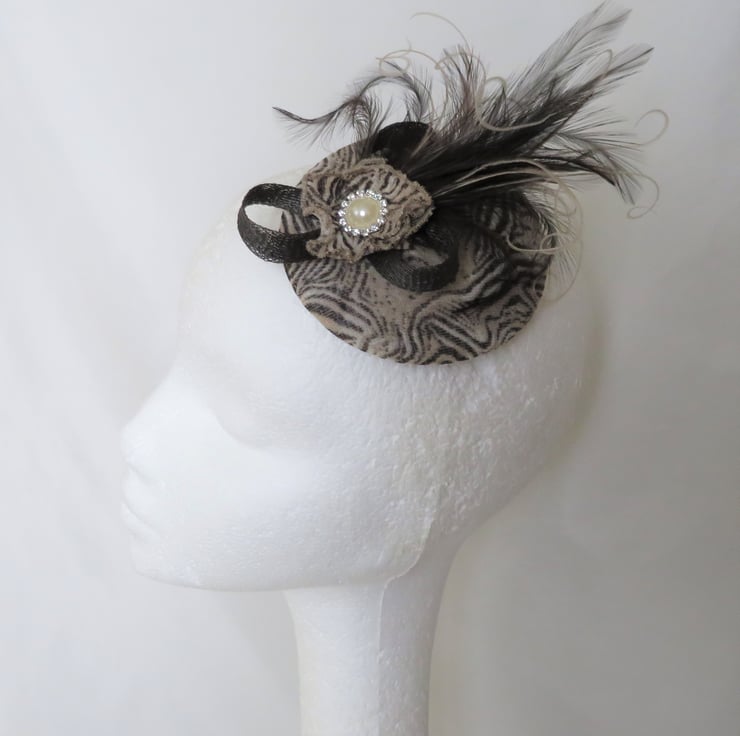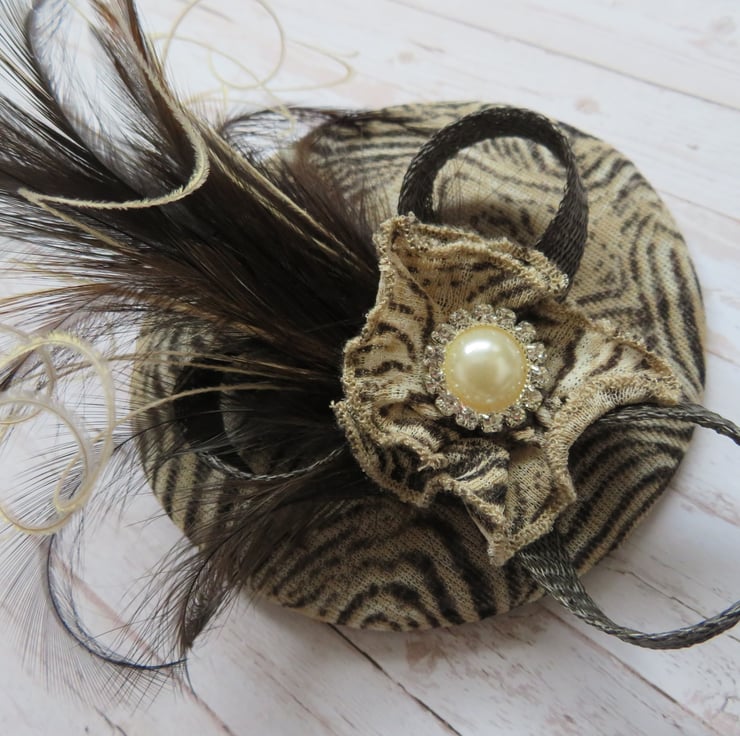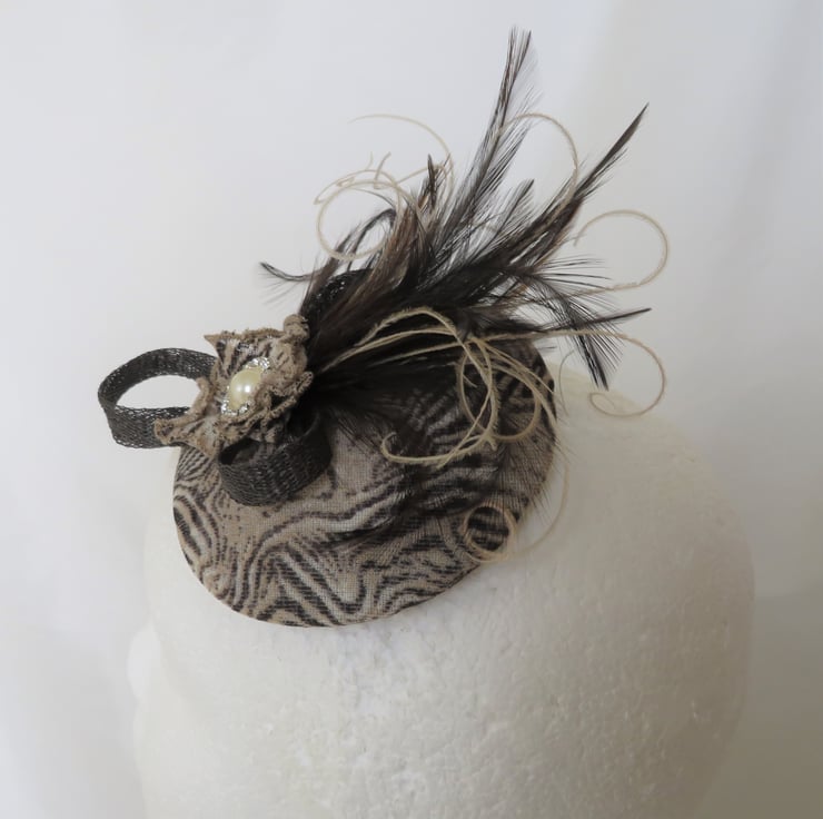 Complemented with a dark brown sinamay mini bow, with a plume of dark chocolate brown soft hackle feathers, with creamy highlights in bleached peacock flume and a small ruffle of the same fabric and a small pearl and diamante stud.