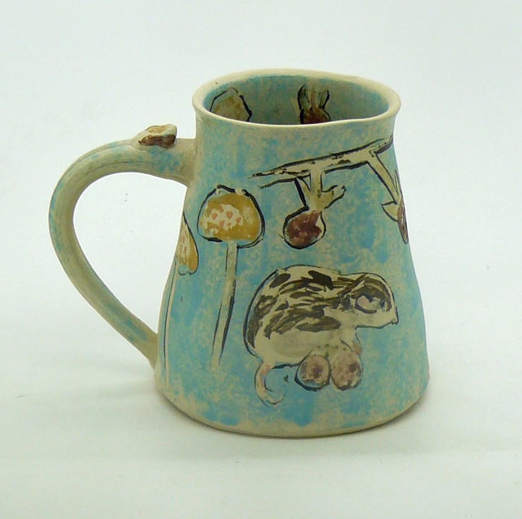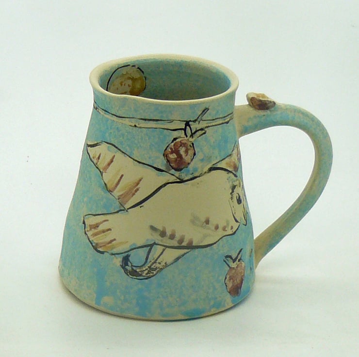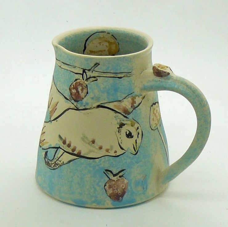 Thrown on the wheel & later hand decorated with an Owl & Mouse sat on raspberries. Can be used for pouring milk or as a vase. 10 x 15 cms.