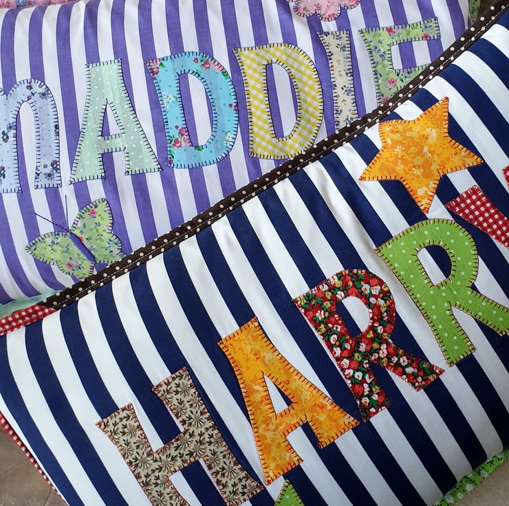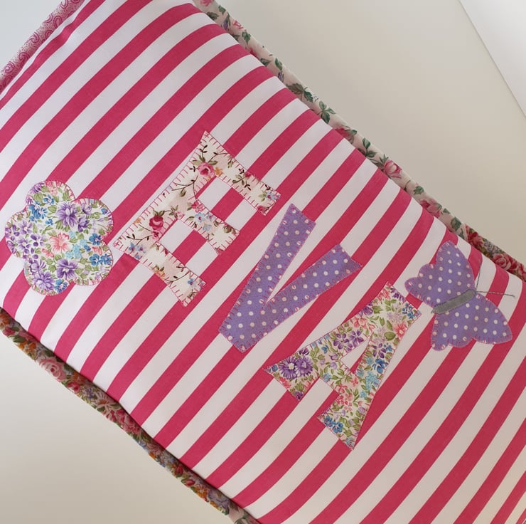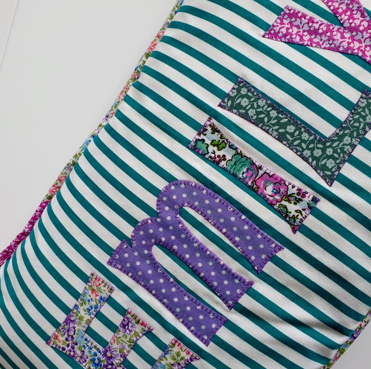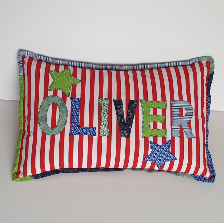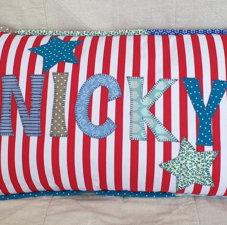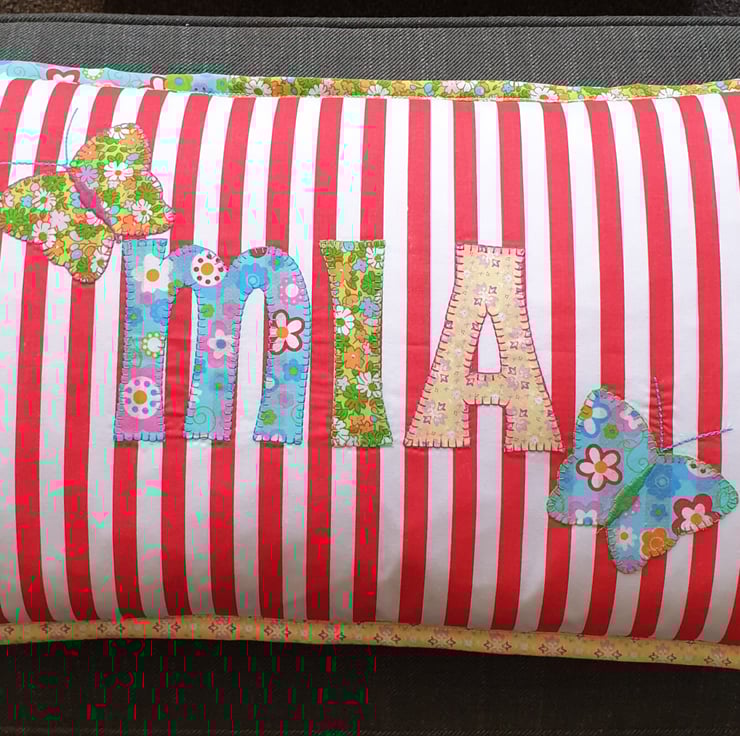 The cover is made from stripey poly cotton in a choice of 6 zingy colours. The name will be appliqued in quality 100% cotton fabric in matching colours. I use all my fabric scraps left from larger projects, so your cushion will be totally unique.
