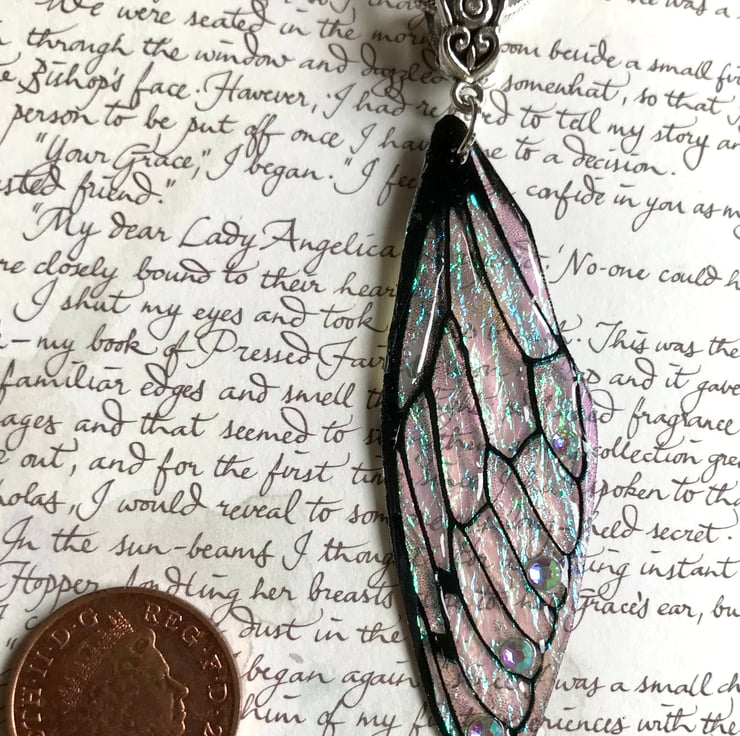 The wing has been glazed which produces a beautiful shine and really enhances the iridescence of the wing. The wing will change from opaque to having flashes of green or purple depending on how the light hits the wings.