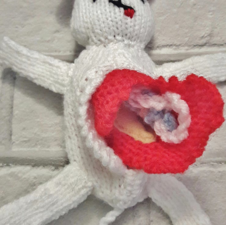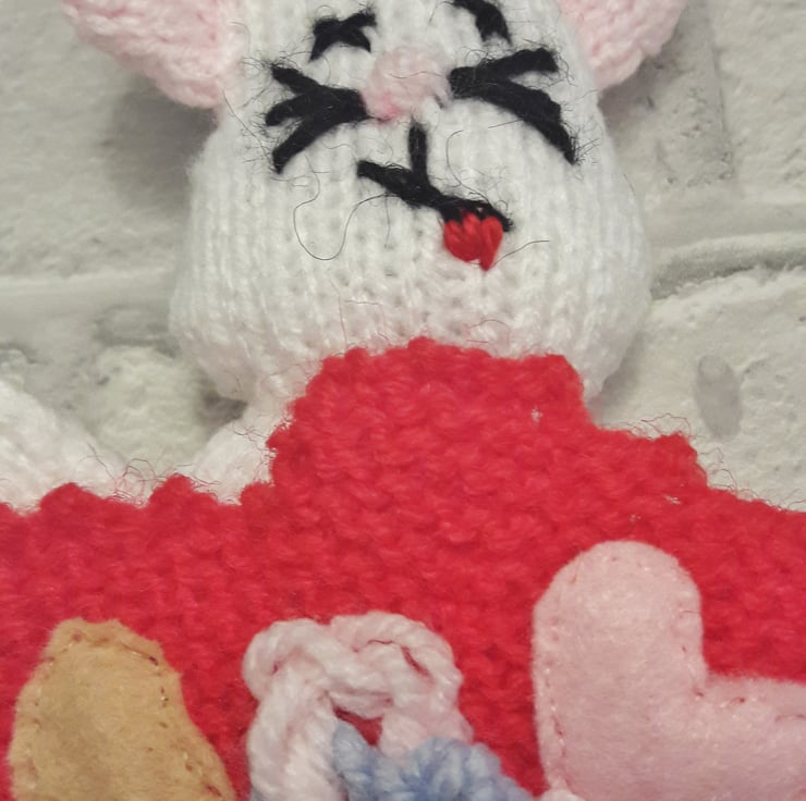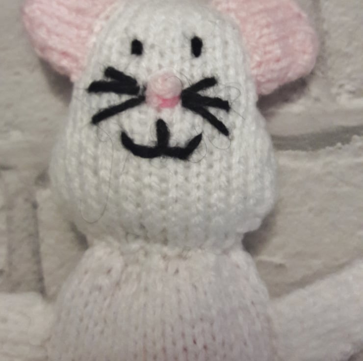 The mouse has been hand knitted using quality acrylic yarn. His features are embroidered and all parts are securely attached. The "guts" are made from acrylic yarn and felt and can be folded back inside his body.