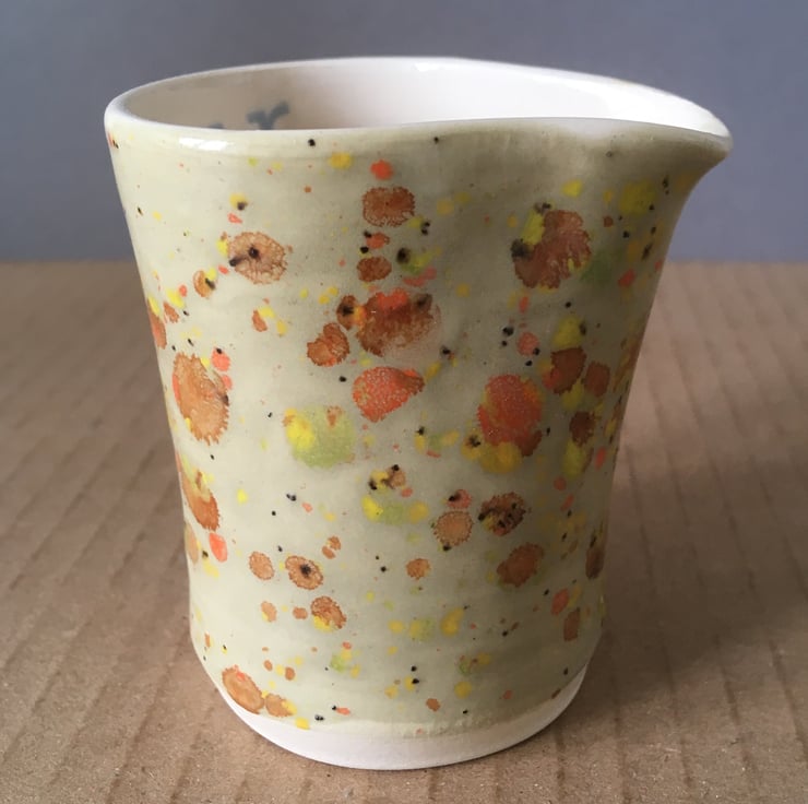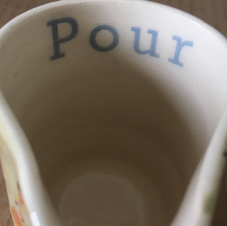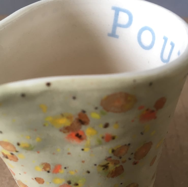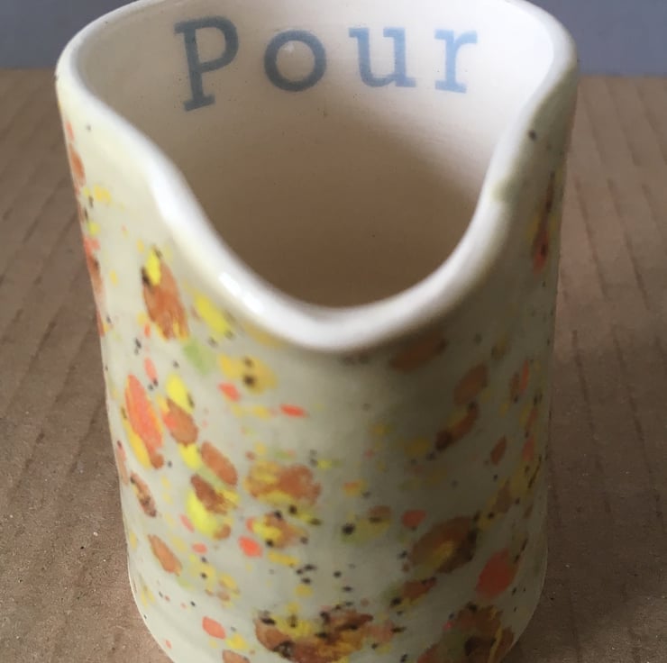 A very cute little jug/pourer. This little fella has a creamy white earthenware body. Created on my pottery wheel. A simple “Pour” decal is fired to a duck egg blue colour. The main body/exterior has a lovely speckled sage green glaze.