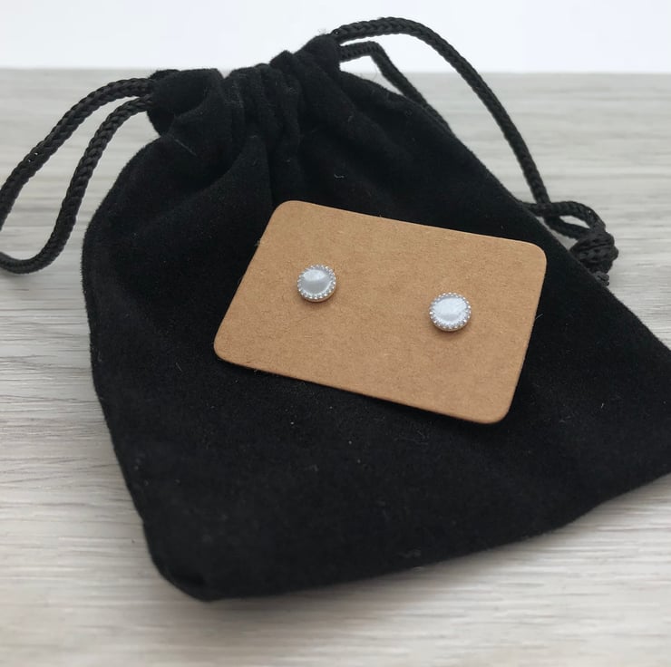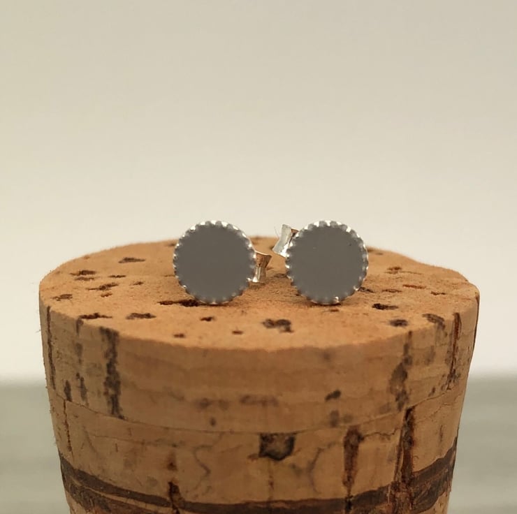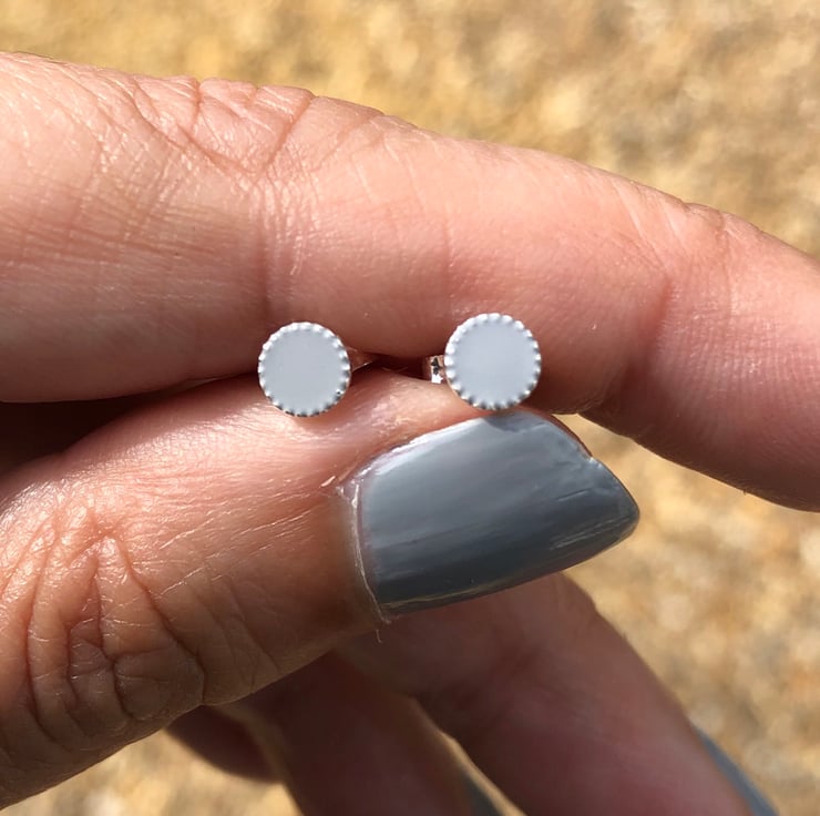 5mm milled edge sterling silver studs filled with layers of cold enamels in a solid colour. Fixed with sterling silver scroll backs.