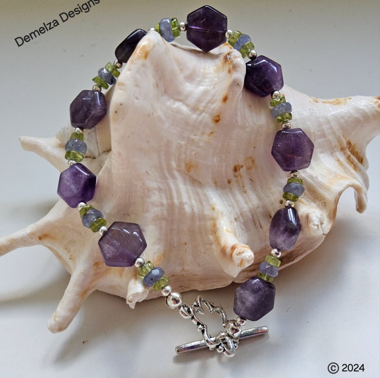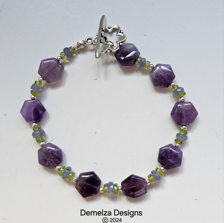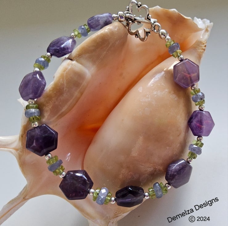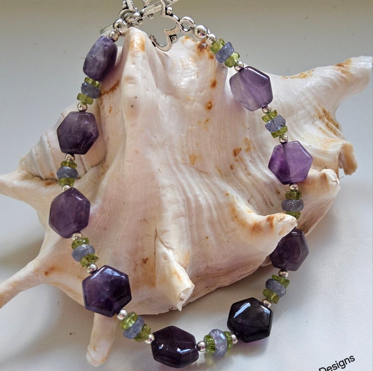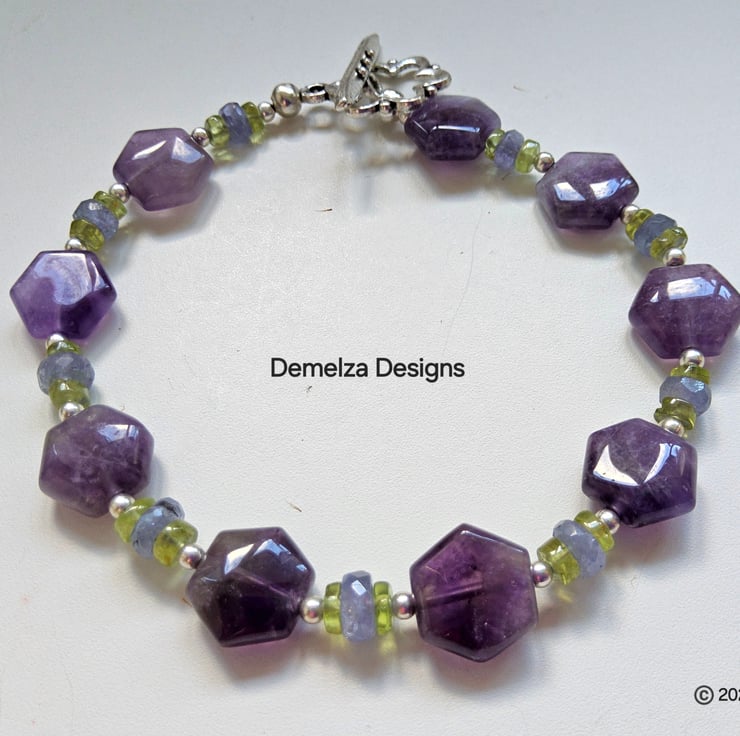 This bracelet will appeal to ladies whom value and appreciate genuine gemstone jewellery which is totally unique for total individuality to wear on a daily bases. Amethyst is the birthstone for February, peridot is the birthstone for August and tanzanite is classified as by the GIA for December.