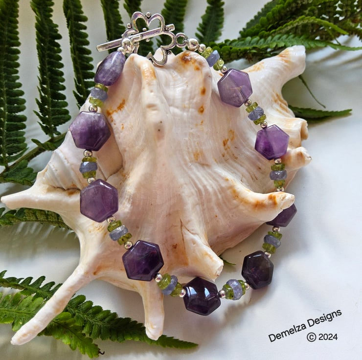 A beautiful eye catching bracelet designed and hand crafted containing a high carrot weight of genuine gemstones. The Tanzanite gemstones are small irregular cut rondelles amounting to 7cts. The genuine amethyst are hezicon cut containing 39cts complimented with irregular cut peridot wheels containing 5.7cts. For the main construction professional stainless steel jewellers wire has been used for added strength and lasting durability, finished off with a flower shaped tibetan silver toggle clasp. Within the design are sterling silver spacer beads.