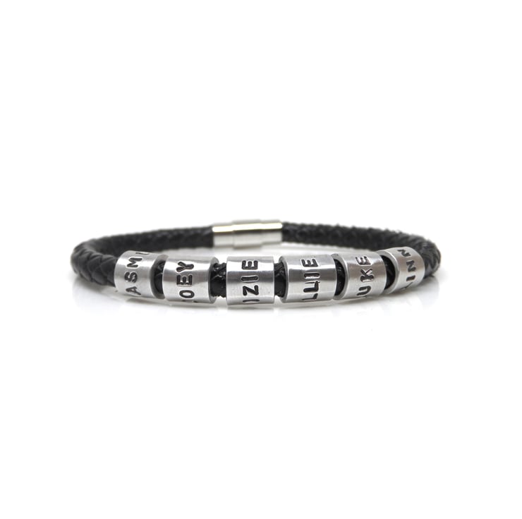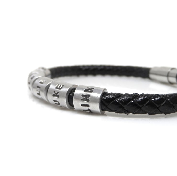 The Six ring Men's Personalised bracelet is made with genuine braided leather that is 6 mm in diameter and has a locking stainless steel connector that ensures that it will not come undone.