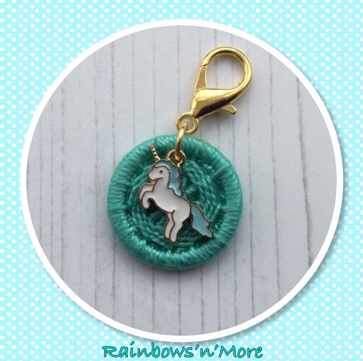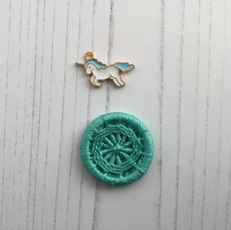 The button has been attached to a gold coloured lobster claw catch together with a sweet enamel unicorn in white with turquoise mane and tail.