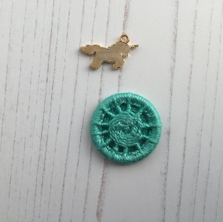 I have made this Dorset Button using a 100% cotton perle thread in a lovely minty turquoise on a 25mm brass ring. The finished button is slightly larger.