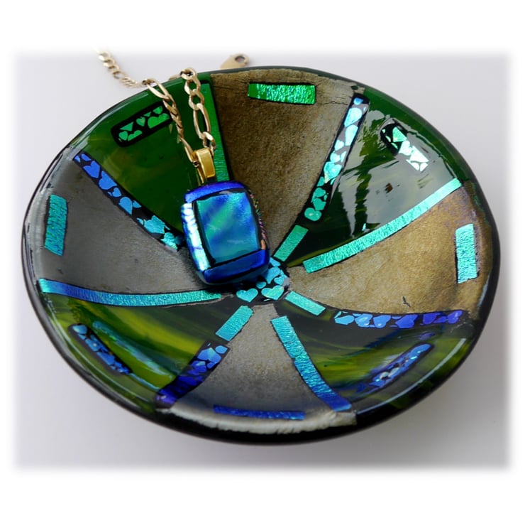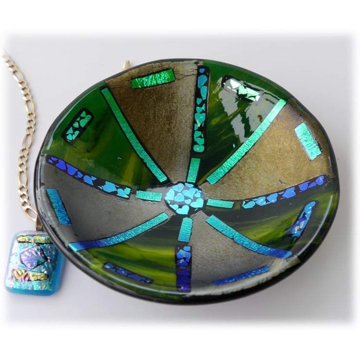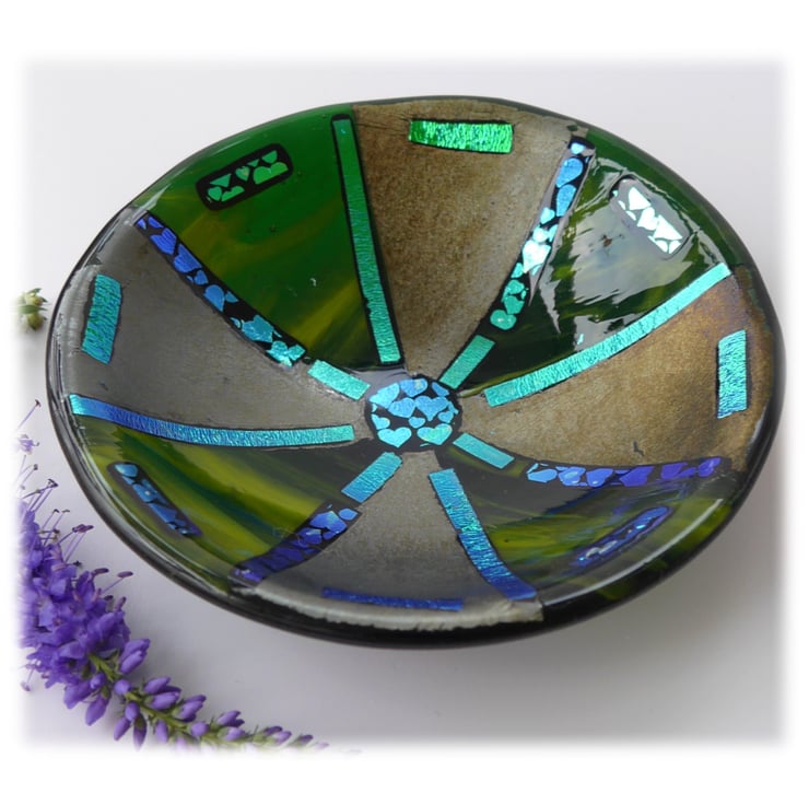 This round dish has a base of deep green glass which is topped with alternate triangles of a streaky deep lime glass and an iridescent deep green.