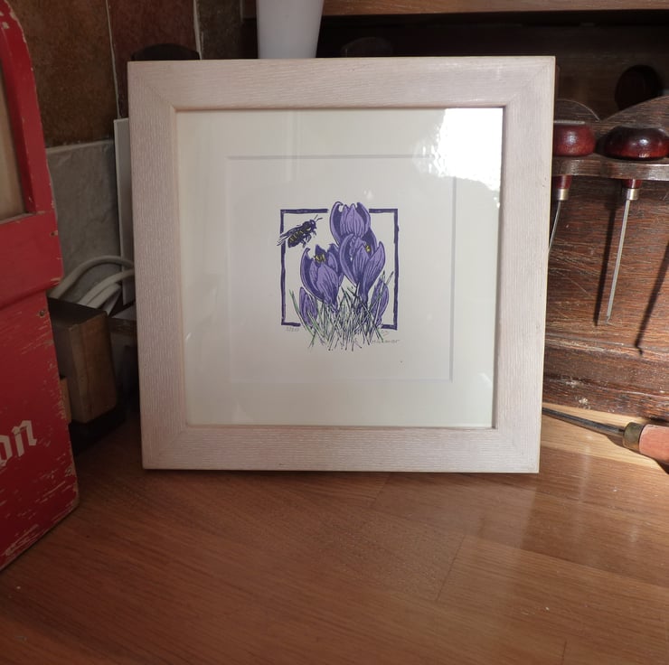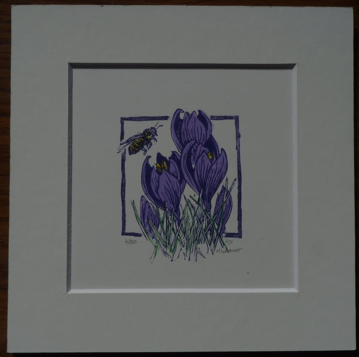 This is an original Lino cut made from 4 different colours on 3 different lino plates. It shows a bee that visited my crocuses earlier this year