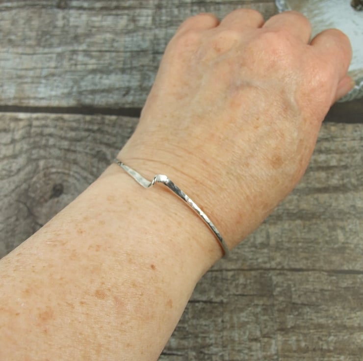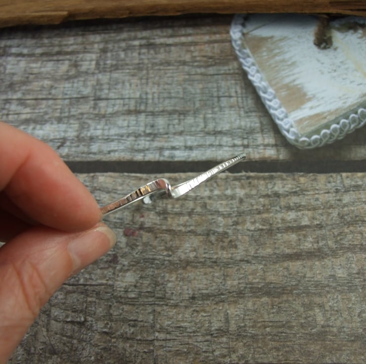 I have made the bangle from 2mm wide solid sterling silver wire which I have shaped and used a hammer to create a line texture.