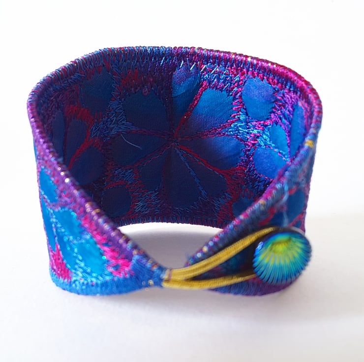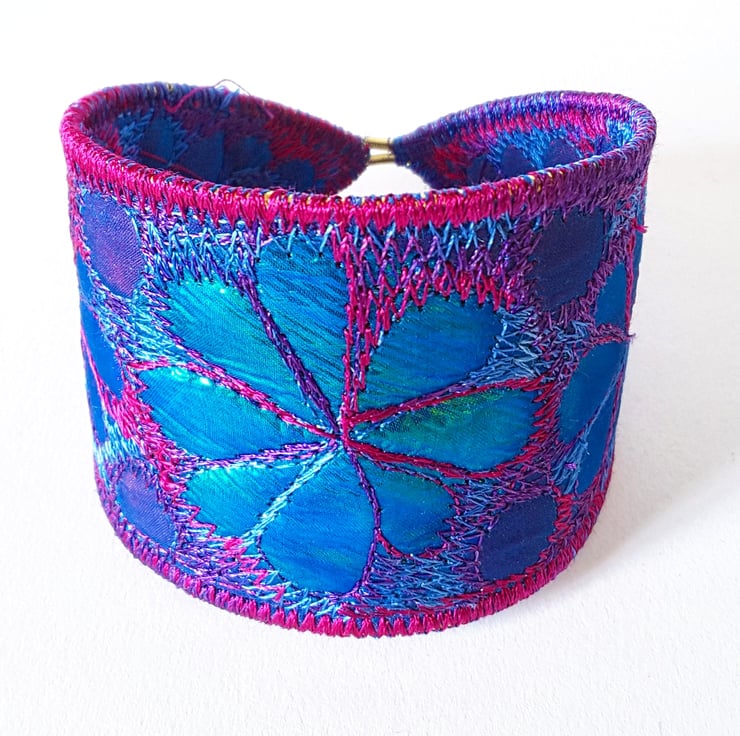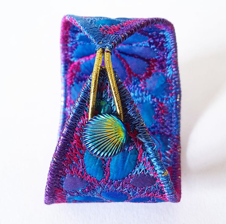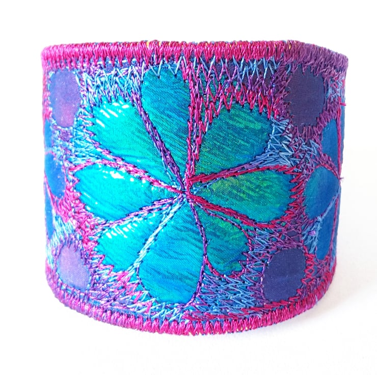 Made from layers of fabric including hand dyed Egyptian cotton and silk fabrics using the free machine embroidery style of sewing