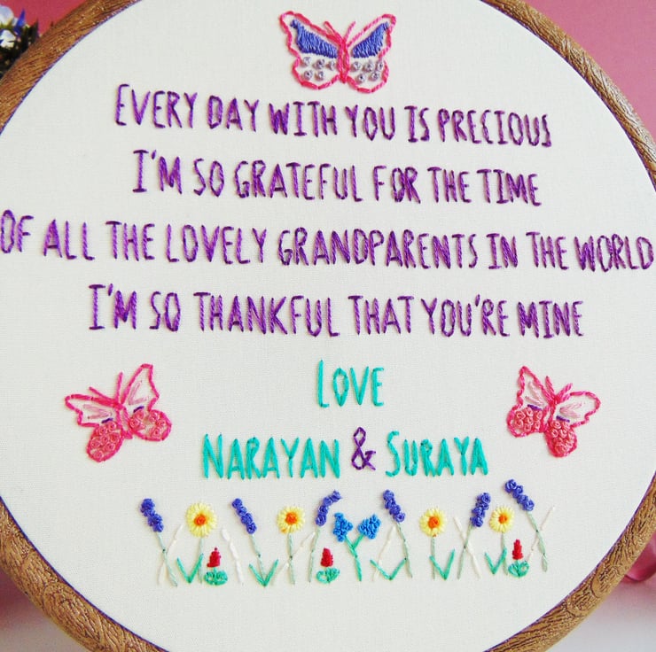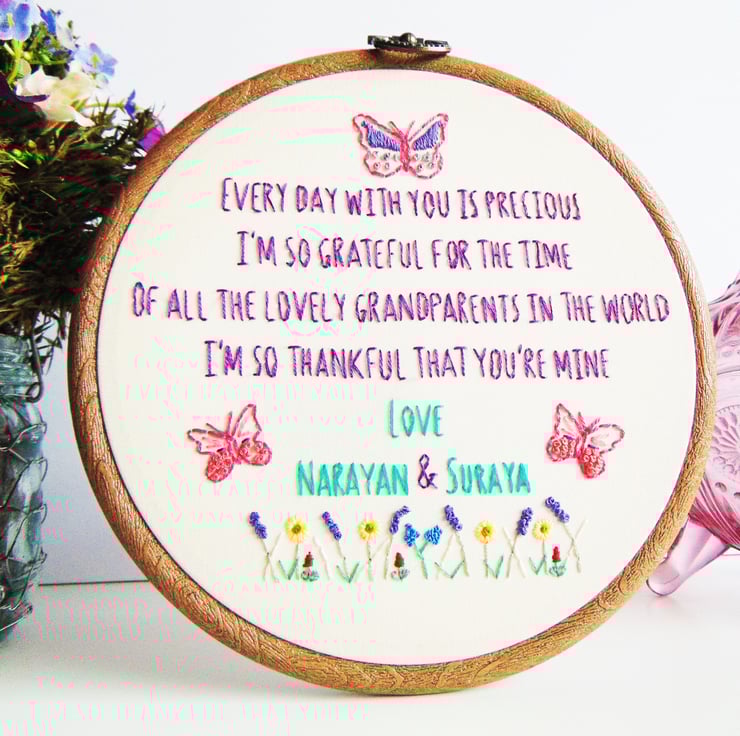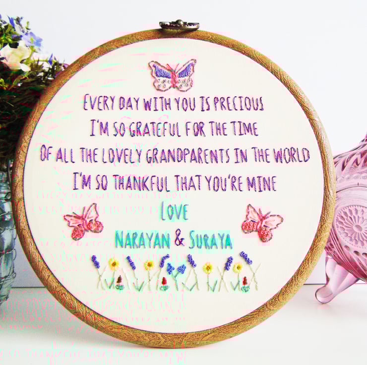 If you're looking for something extra special for a loving grandparent/s then this is the perfect gift for you. It features a beautiful quote about amazing grandparents, can be personalised and has three sweet butterflies with a wildflower garden. This hoop is made to order, set in a six inch embroidery hoop and is sewn onto cream cotton fabric.