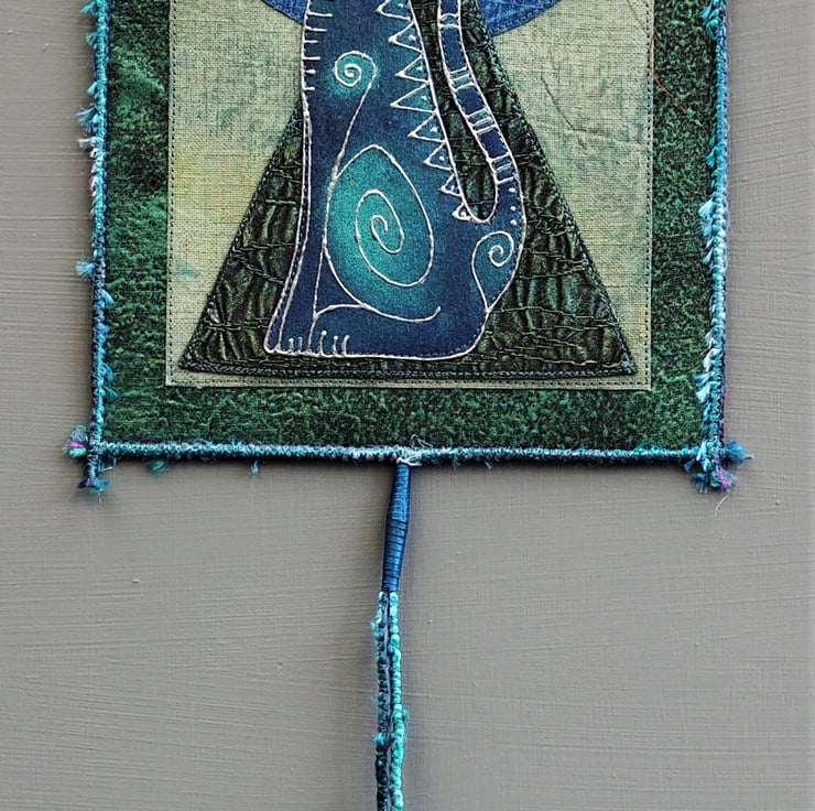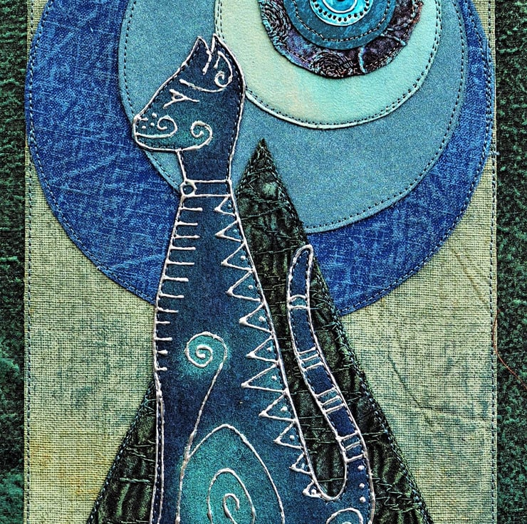I printed then painted the Egyptian cat design onto stiffened fabric with lino then outlined it in silver. The background, pyramid and moon are various painted fabrics with stitched details. The metal spiral on the moon is cut from an embossed and colored, softened drinks can. Everything is secured in place with blue/green/metallic machine stitching. The mixed yarns are added to tone/compliment the finished piece. Plain black fabric on the reverse and stiffened to hold it's shape. Light fast but should not be hung in direct or bright sunlight for long periods.Thanks for looking Vx