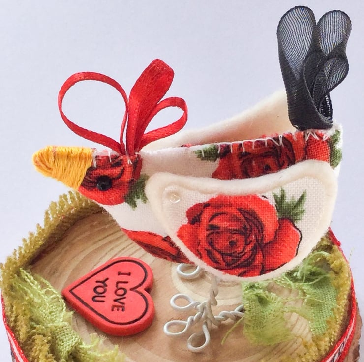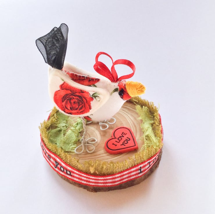 This special textile chick is made with a rose fabric body and wings she has a lovely black chiffon ribbon tail. Tiny seed bead eyes and an I love you button below. Stapled to her wooden base and surrounded by her green linen frayed grass with her very own ribbon fence hopefully she won’t escape! I am sure she would love to come and perch on your shelf.