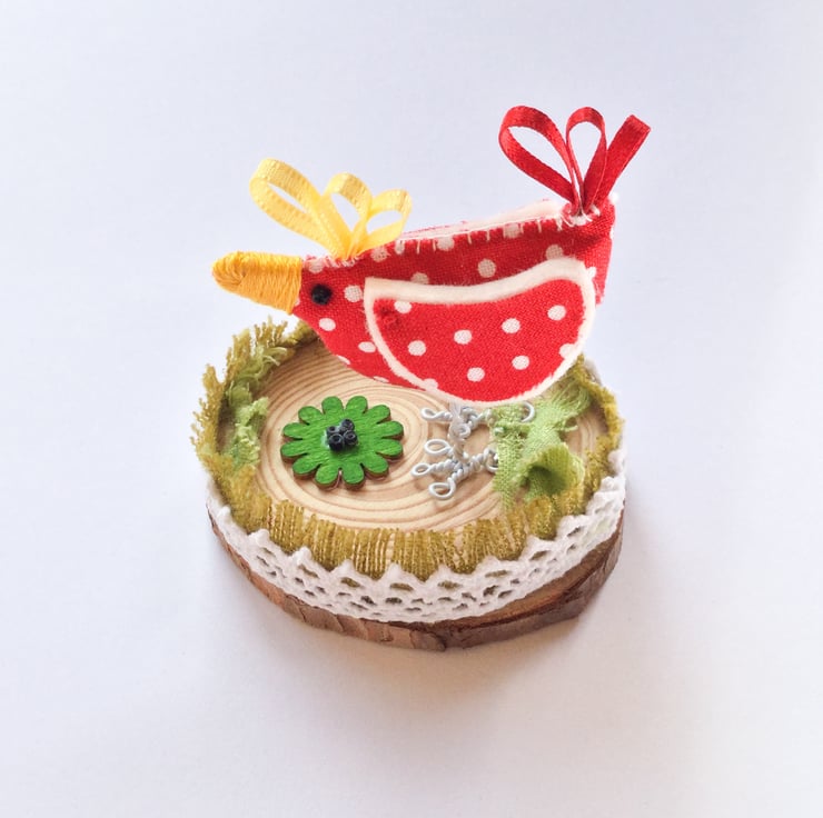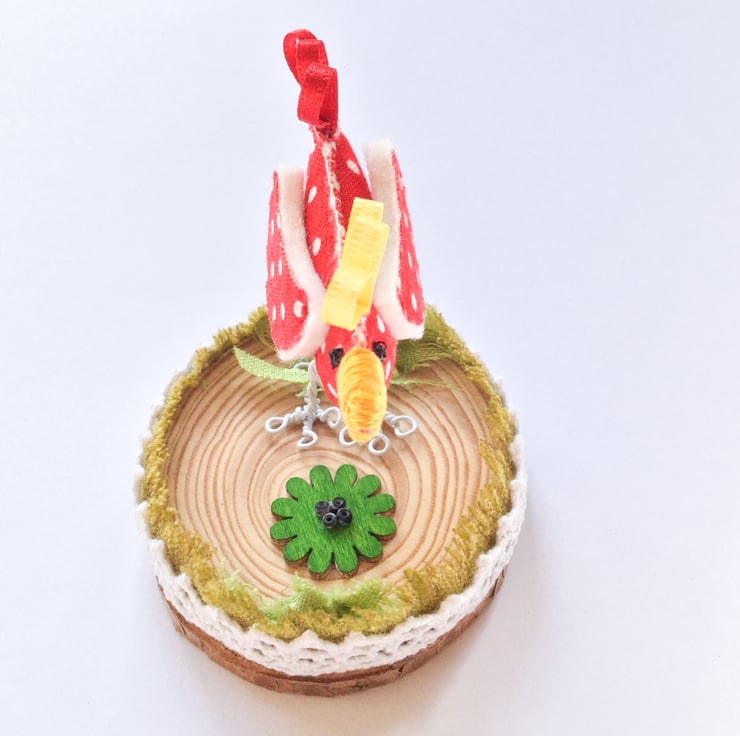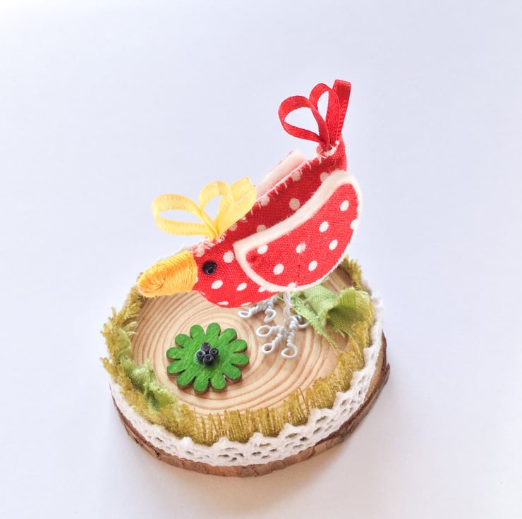 Little Red the dotty chick sits atop her wooden plinth. With her fabric body and ribbon tail feathers she is having a good look around her new plot! This chick has been stapled to her base and frayed linen grass with lace ribbon fencing will hopefully keep her in check.