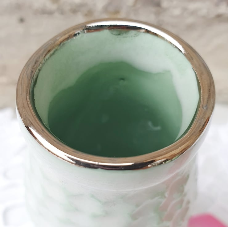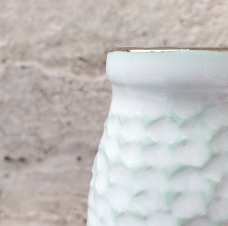Each vase is individually carved to create the markings in the porcelain. This gives a texture and surface that is cool and tactile. It also creates a surface to glaze to run over and pool into. These carvings make each individual vase unique. This particular example is made with porcelain stained to a green colour, with a white glaze on top breaking to show the green beneath. A platinum lustre is applied and it is fired for a third time.