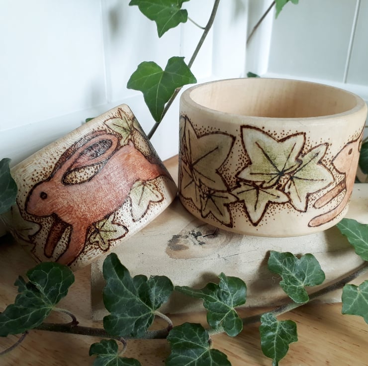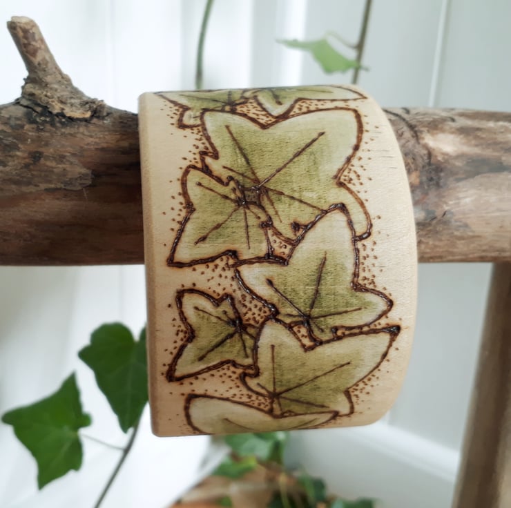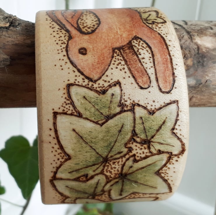 Flat wooden bangle illustrated with a running hare & lots of ivy leaves using pyrography (wood burning).