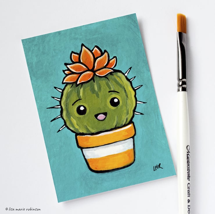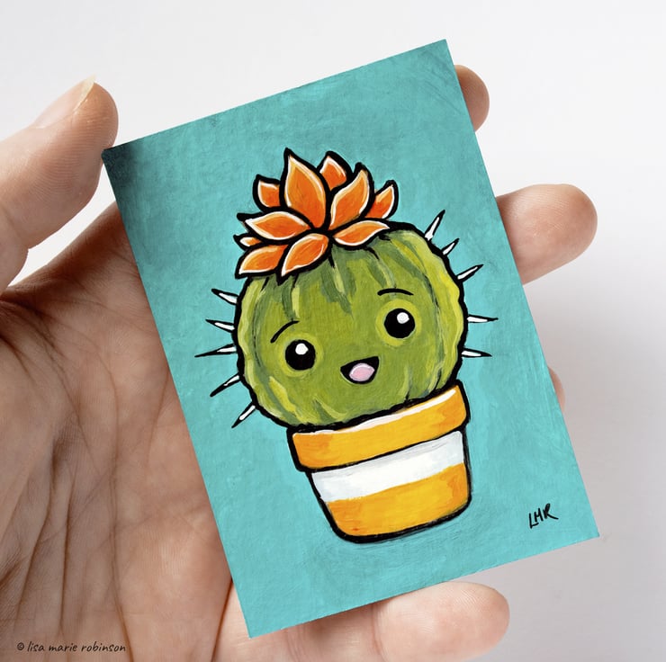 Miniature illustration of a cute kawaii style cactus with an orange flower and yellow & white striped pot .