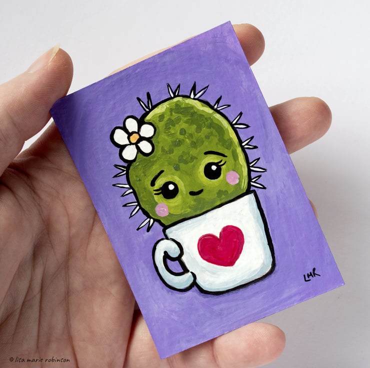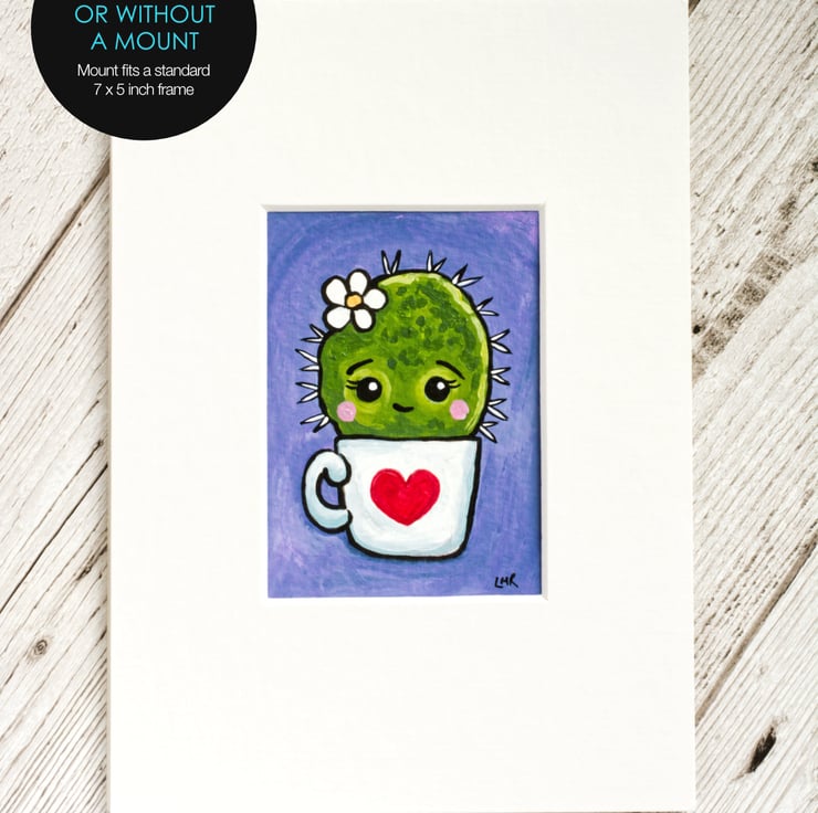 Miniature illustration of a cute kawaii style cactus. She sits in a white cup with heart motif and has blushing cheeks, and a white flower .