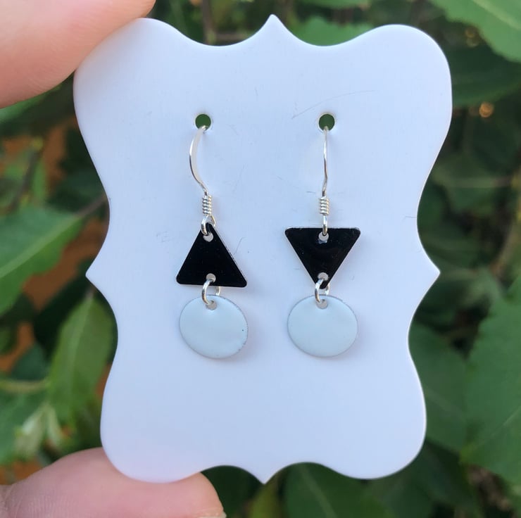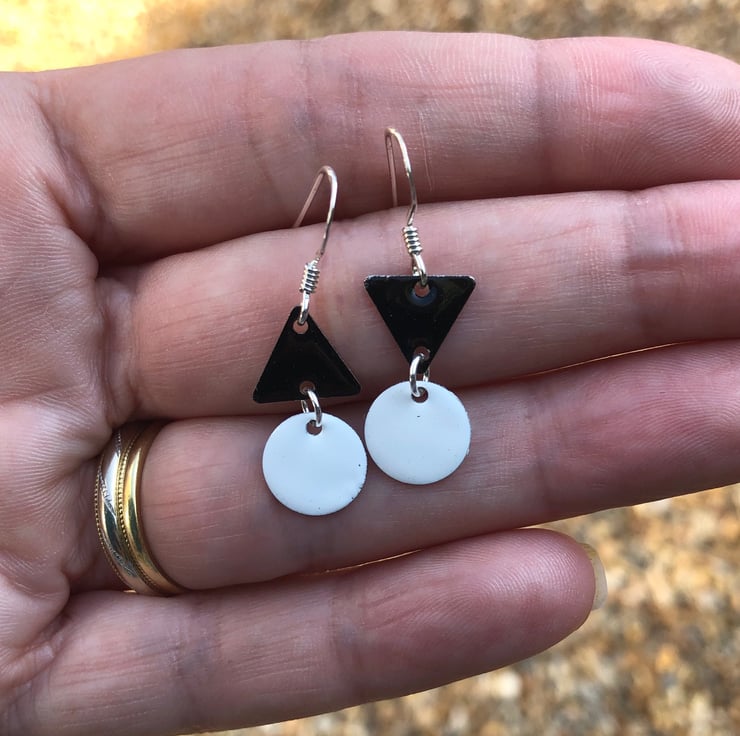 Topsy-turvy Hand enamel earrings. Black and white enamel earrings.