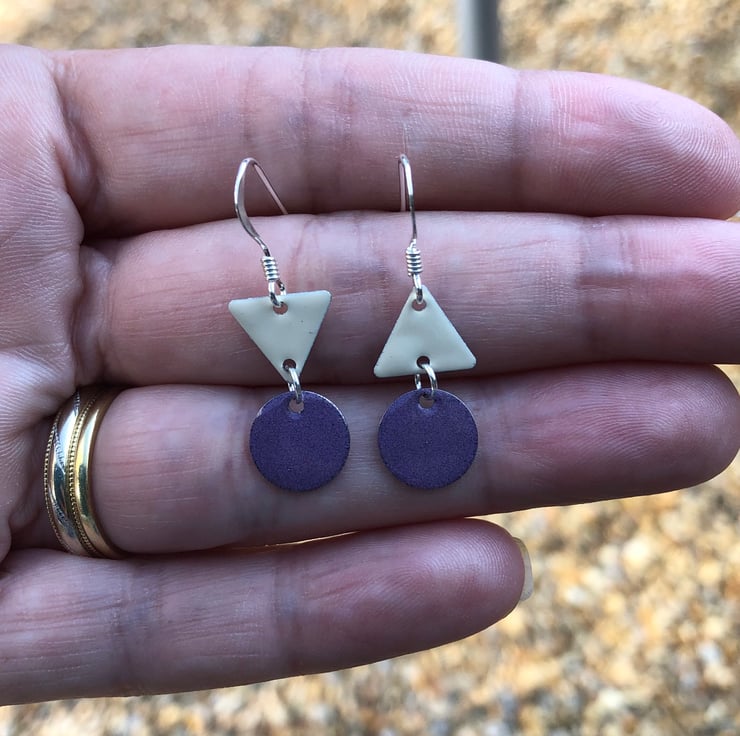 Topsy-turvy Hand enamel earrings. Purple & cream enamel earrings.