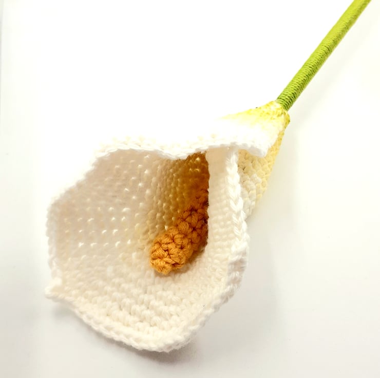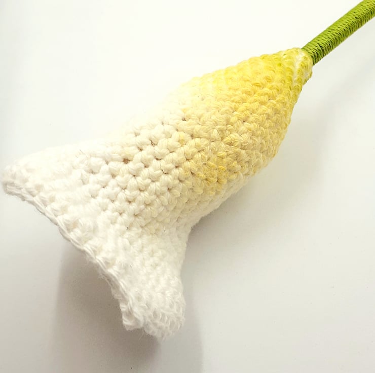 This striking bloom is crocheted in cotton from a pattern by Lin at She's Crafty. The stem is made from a length of wooden dowel wrapped in cotton yarn. The base and inside of the flower have been coloured with fabric paint. The whole flower and stem measures approximately 36 cm in length.