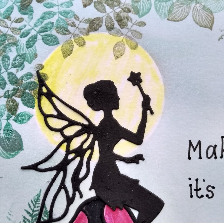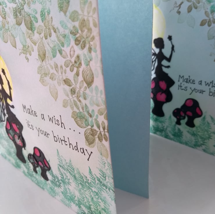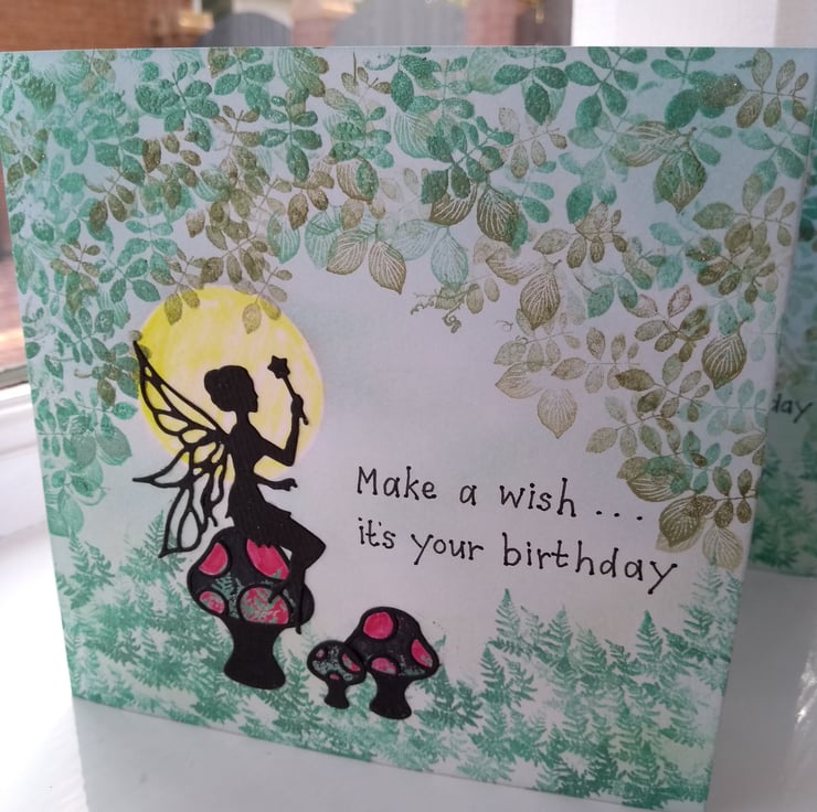 A completely handmade and uniquely designed card. Consisting of quality pristine white card which has been stamped and clear embossed with leaves and ferns. A row is 3 mushrooms die cut from black card and hand coloured. On top of the large one sits a delicate fairy die cut from black card. Finished off with ' make a wish- it's your birthday' handwritten in black ink.