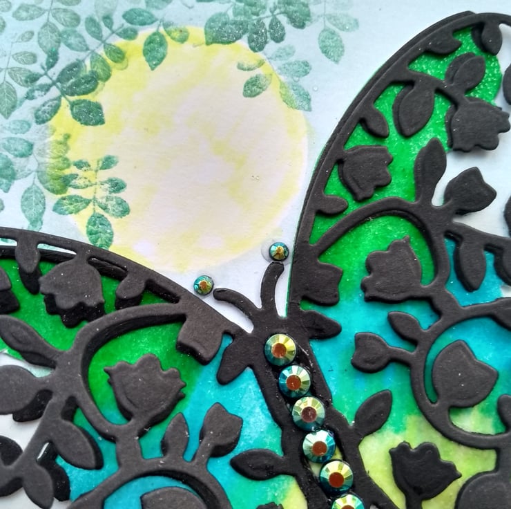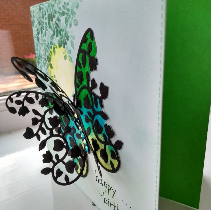A completely handmade and uniquely designed card. Consisting of quality pristine white card which has been shared using blue merging into green stamp ink. Foliage hand stamped and clear embossed. The butterfly die cut from black card and hand coloured and clear embossed. Finished off with co ordinating rhinestones and happy birthday handwritten in black ink.