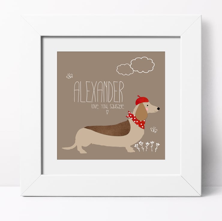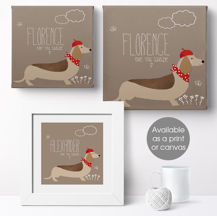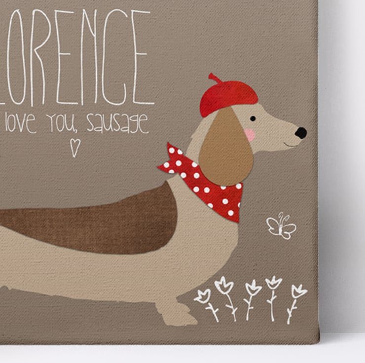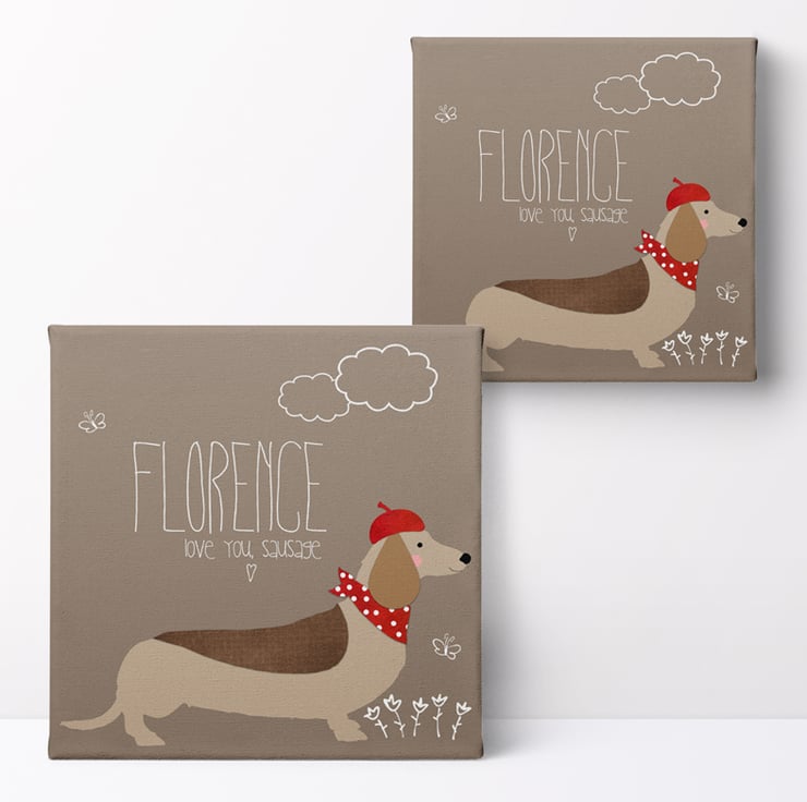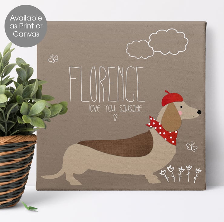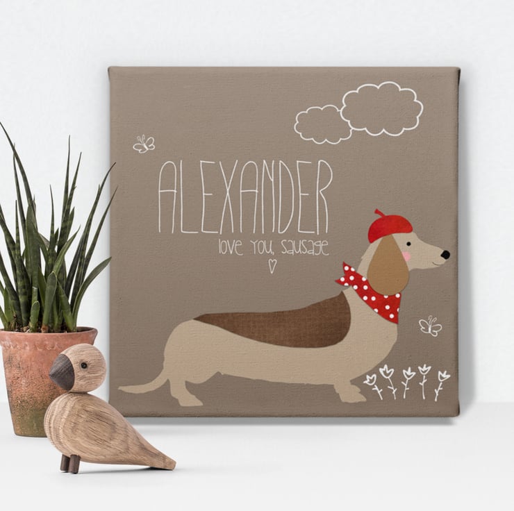 The perfect gift for your loved one, this charming personalised Sausage Dog canvas will delight dog lovers and dachshund owners too!