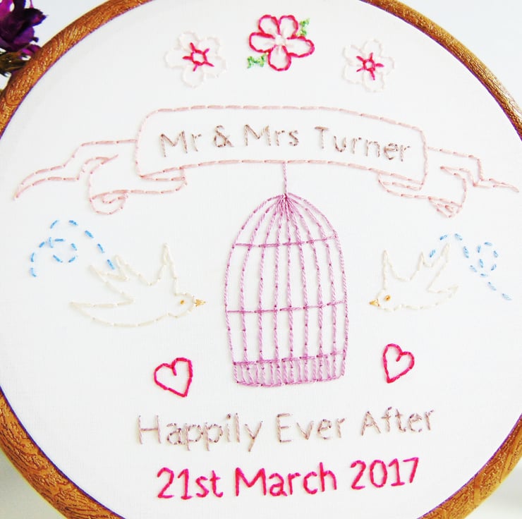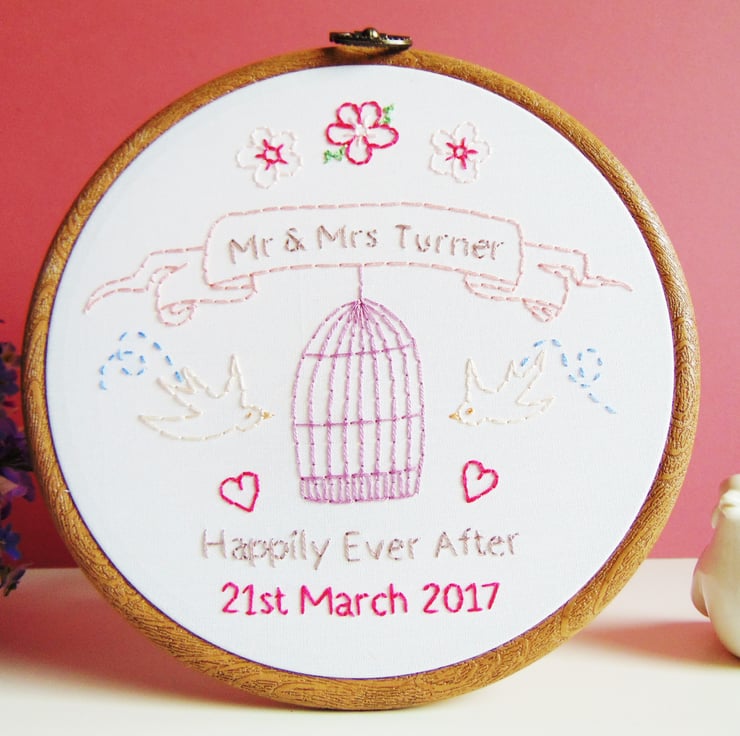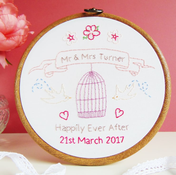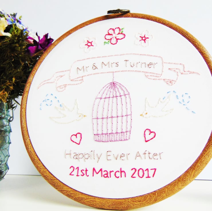 My original Vintage Chic theme design is the perfect wedding or anniversary gift for those who love that shabby chic, birdcage, floral, pastel style. It features a scroll which can be personalised, birdcage, birds, flowers and hearts. I can also add text to the bottom such as a quote, lyrics, message and date. These hoops are made to order, set in a six inch embroidery hoop and sewn onto white cotton.