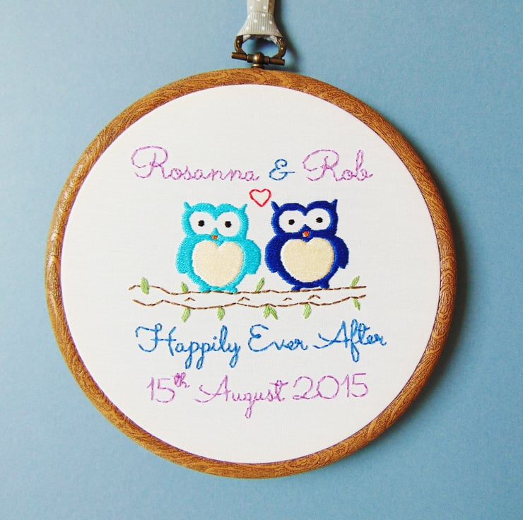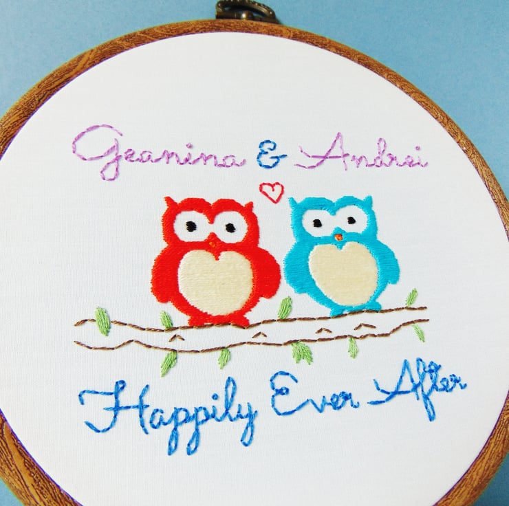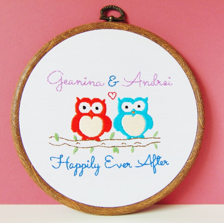 My very cute Owl Love hoops are the perfect anniversary, engagement or wedding present. They feature two hand stitched owls perched on a branch, any names and other text of your choosing and the entire hoop is sewn in your preferred colours. These come sewn onto white fabric and set in a six inch hoop.