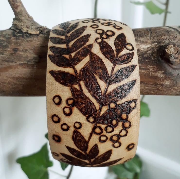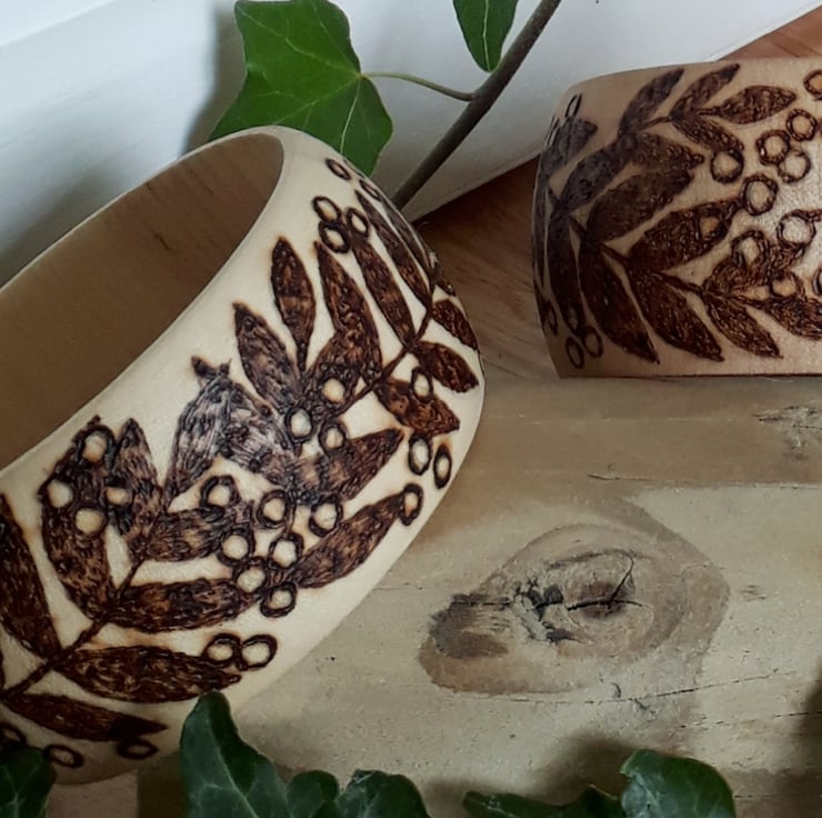 Round wooden bangle illustrated with lots of Rowan berries & leaves using pyrography (wood burning).