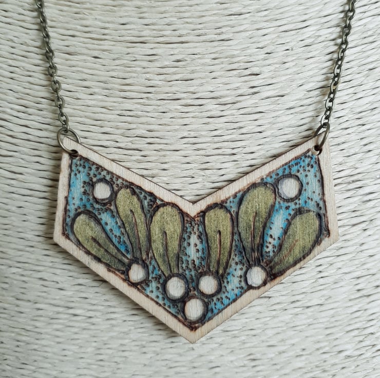 Wooden pendant illustrated with mistletoe using pyrography (wood burning).
