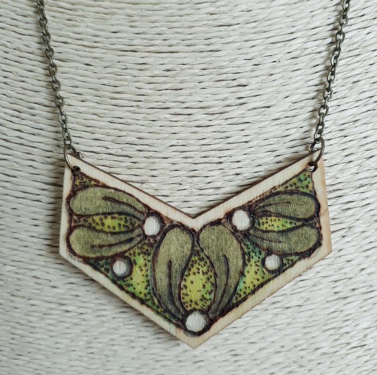 Wooden pendant illustrated with mistletoe using pyrography (wood burning).